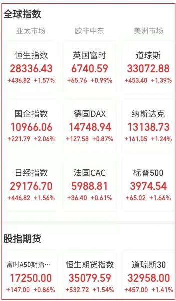 美东时间周五,美股收涨,三大指数涨幅均超过1%,道指、标普500指数创收盘历史新高。盘面上,大型科技股、芯片股、油气股、航运股普涨,部分教育类中概股大跌。截止收盘,道指涨453.40点,涨幅1.39%,报33072.88点;纳指涨161.05点,涨幅1.24%,报13138.73点;标普500指数涨65.02点,涨幅1.66%,报3974.54点。