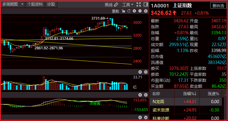 技术上创业板指数日线周期收带下影小阴线,上证日线周期收带下影小阳线,小时周期MACD指标快慢线零轴下方金叉张口,红色量能柱放量,15分钟周期MACD指标快慢线零轴上方金叉张口,红色量能柱放量,5分钟周期运行子浪级别反弹,成交量较上日小幅放量。