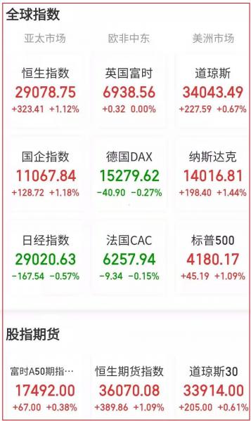 美东时间周五,美股三大指数集体收高,标普500指数盘中刷新历史新高。截止收盘,道指涨227.59点,涨幅0.67%,报34043.49点;纳指涨198.40点,涨幅1.44%,报14016.81点;标普500指数涨45.19点,涨幅1.09%,报4180.17点。热门中概股收盘普涨,优信飙升超58%,该股尾盘直线拉升,最高涨超80%。此前优信宣布将通过京东电商平台推出二手车自营网店,并将于4月28日美股盘前公布2021财年第三季度业绩。