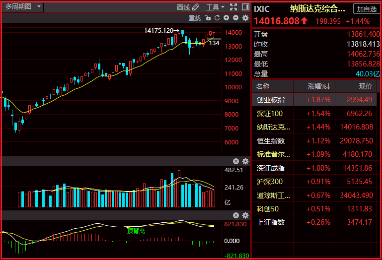 技术层面纳斯达克指数再前高位置附近迟迟不突破,如果连续盘整,且无法创新高,则很有可能出现盘整头部,这个是短期得风险点,目前依然是上涨结构之中,短期需要留意多看分水岭13400一线是否跌破,如果不破则还有继续反弹得可能,但是跌破则开始大级别调整。