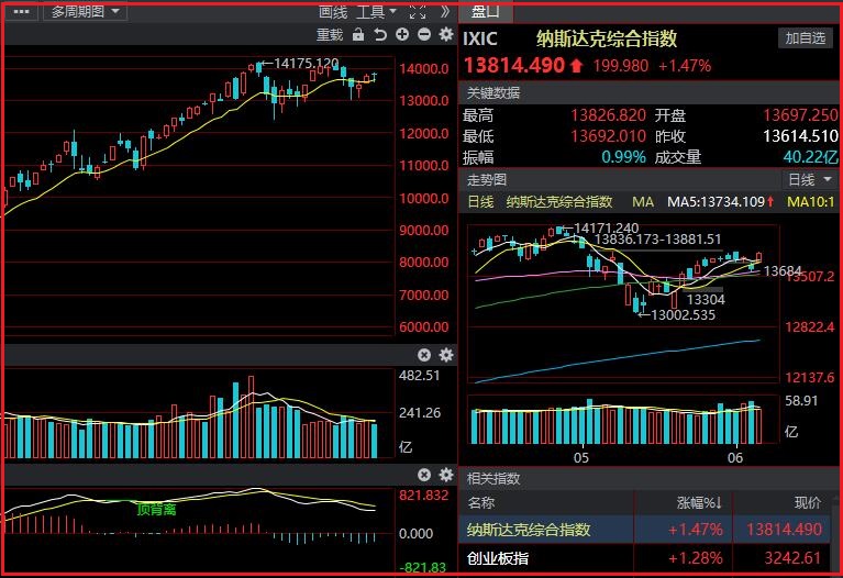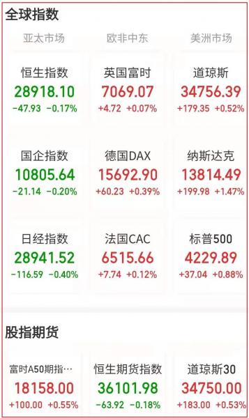 美东时间周五,美国股市三大指数集体上涨,纳指涨幅超过1%。截止收盘,道指涨179.35点,报34756.39点,涨幅为0.52%;纳指涨199.98点,报13814.49点,涨幅为1.47%;标普500指数收涨37.04点,报4229.89点,涨幅为0.88%。盘面上,美股大型科技股普涨,特斯拉涨超4%,英伟达涨超3%,苹果、微软、谷歌涨2%左右;抗疫概念股集体上涨,美股银行股多数上涨,美国能源股涨跌不一,热门中概股多数上涨。