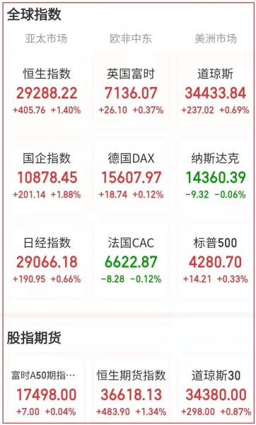 在欧洲各国股市中,德国DAX 30指数收涨1.04%,报收于15607.97点;英国富时100指数涨1.69%,报收于7136.07点;法国CAC 40指数收涨0.82%,报收于6622.87点。与此同时,意大利富时MIB指数收涨1.11%,报收于25507.50点。