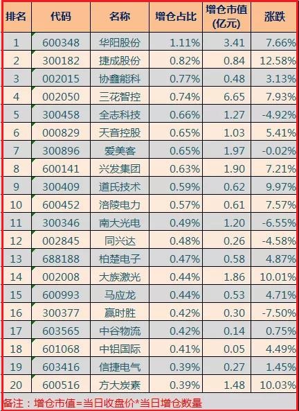 4.从主力资金流动情况来看,外资主力今天净卖出12亿元左右,内资主力净流出额超过530亿元。其中主力净流出较大的板块就是电子元件,仅今日一天主力净流出额就超过了145亿元,而最近十个交易日其净卖出更是超过了600亿元,就连平时一直被主力持续卖出的医药制造板块,在今天电子元件板块的对比之下,也已经黯然失色;主力资金流入额较大的板块主要集中在了有色金属、化纤行业等,但是这些板块的主力净流入额并不大,说明短期的主力资金仍然偏向谨慎。截至A股收盘,统计数据显示北向资金全天净流出12.38亿元,沪股通流出7.94亿元,深股通净流出4.43亿元。北向资金本周累计净流入12.76亿元。在增仓占比方面(增仓数量/流通股),华阳股份(600348)、捷成股份(300182)、协鑫能科(002015)、增仓居前3位,增仓市值分别为3.41亿元、0.84亿元、0.48亿元,增仓占比前20只股票如下(已剔除当日除权股票):
