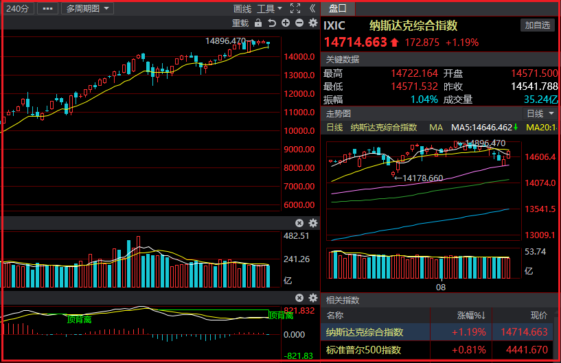 美东时间周五,美国股市三大指数集体收涨,截止收盘,道指收涨225.96点,涨幅为0.65%,报35120.08点;纳指收涨172.87点,涨幅为1.19%,报14714.66点;标普500指数收涨35.87点,涨幅为0.81%,报4441.67点。盘面上,科技股、抗疫概念股涨幅居前,微软收涨2.56%,盘中一度刷新历史高位;部分热门中概股大幅上涨,知乎涨超15%,拼多多、理想汽车涨超3%,京东、网易涨超2%。