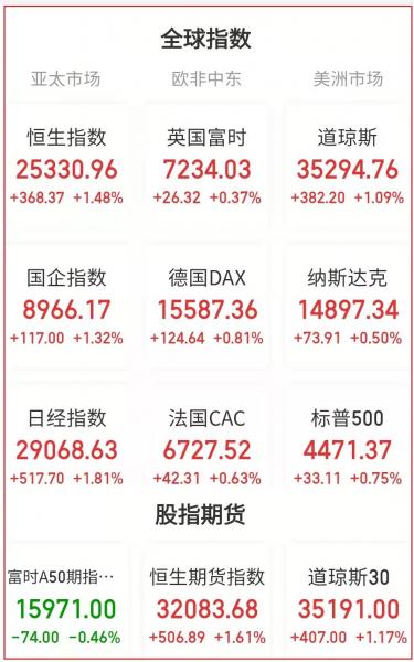 在欧洲各国股市中,英国富时100指数涨1.95%,报收于7234.03点;德国DAX 30指数收涨2.51%,报收于15587.36点;法国CAC 40指数收涨2.55%,报收于6727.52点。与此同时,意大利富时MIB指数收涨1.69%,报收于26484.00点。