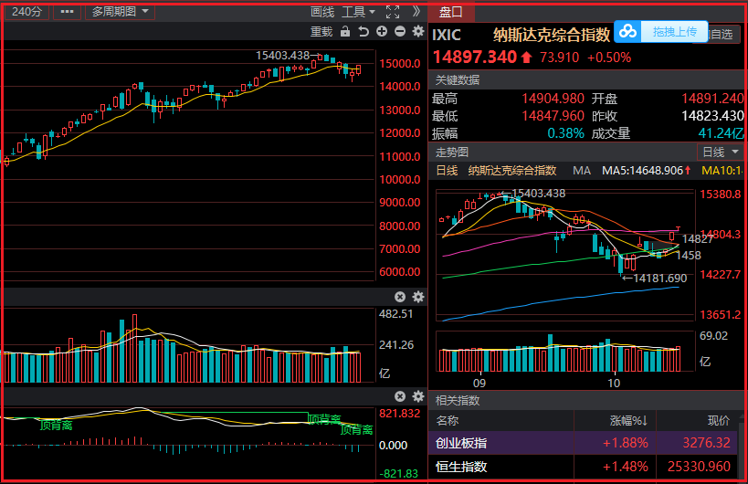 技术层面纳斯达克指数日线级别区间震荡,上升通道没有跌破,但短期压力再15000整数关附近,若站上15000,则重返多头区间,不排除再次测试前高的可能性,下方支撑14500,等待突破。