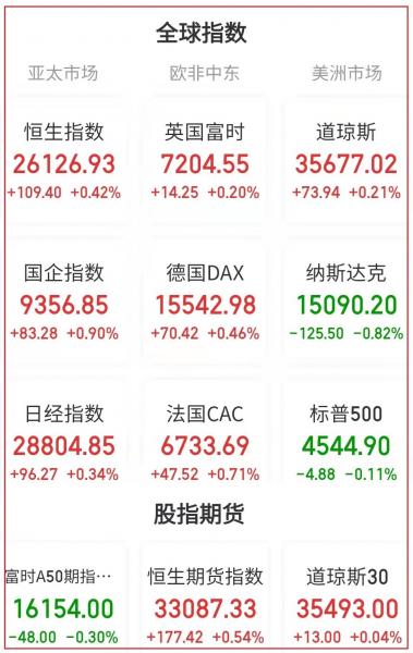 在欧洲各国股市中,英国富时100指数收跌0.39%,报收于7204.55点;德国DAX 30指数收跌0.28%,报收于15542.98点;法国CAC 40指数收涨0.09%,报收于6733.69点。与此同时,意大利富时MIB指数收涨0.33%,报收于26571.00点。