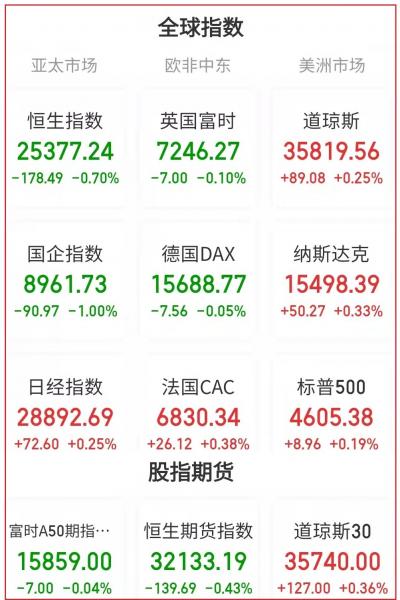 在欧洲各国股市中,英国富时100指数收涨0.58%,报收于7246.27点;德国DAX 30指数收涨0.94%,报收于15688.77点;法国CAC 40指数收涨1.44%,报收于6830.34点。与此同时,意大利富时MIB指数收涨1.21%,报收于26893.00点。