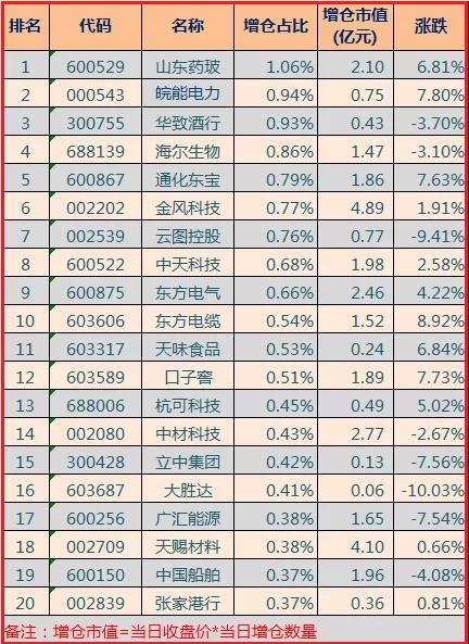 4. 尽管中国股市今年总体呈震荡走势,但随着市场对估值和政策长期影响的重新评估,外资机构对中国股票的观点也逐步转向积极。本周一,高盛公布了有望从国家“共同富裕”政策方向中受益的50只中国股票(含部分港股),强调监管改革也能带来机遇的观点。高盛分析师Kinger Lau等人在报告中表示,与制造业升级、绿色能源、国企改革、大众消费等主题相关的公司将从“共同富裕”计划中受益。同样在本周,汇丰控股分析师将中国股票评级从“中性”上调至“增持”。此外,贝莱德、瑞银和富达国际近期也对中国股票的前景作出乐观评估。在增仓占比方面(增仓数量/流通股),山东药玻(600529)、皖能电力(000543)、华致酒行(300755)、增仓居前3位,增仓市值分别为2.1亿元、0.75亿元、0.43亿元,增仓占比前20只股票如下(已剔除当日除权股票):