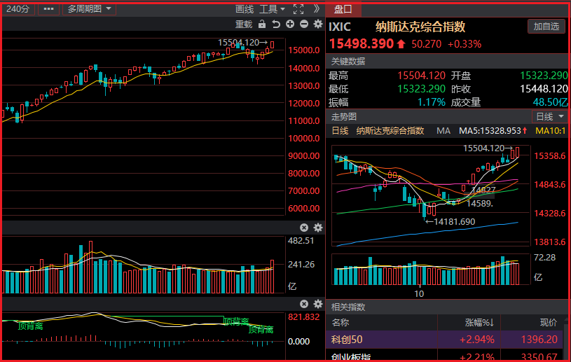 技术层面纳斯达克指数突破前高,短期有望向上加速,此前盘整支撑15200不破,则维持强势多头不变,下方多空分水岭15000不破,则等待低吸机会为主,在震荡上行的过程重不宜过分追涨。