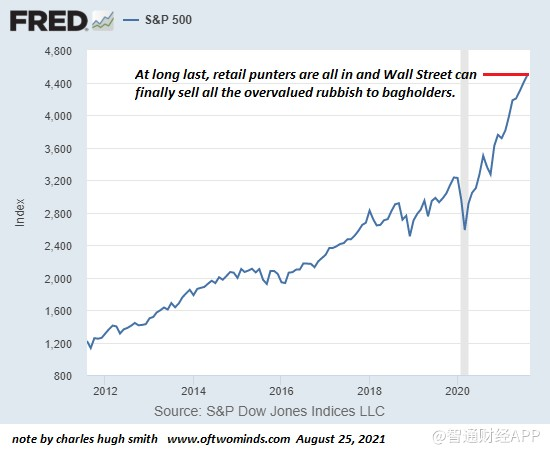 财经评论作家CharlHughith发布文章称,要识别股市中史无前例的投机泡沫其实非常简单:如果华尔街说这不是泡沫,那它就是泡沫。 从长远来看,整个“投资”游戏可以归结为以下过程: 华尔街和美联储扩大了前所未有的债务融资投机泡沫,然后诱使散户“投资者”(即赌徒)加入,承诺巨额收益才刚刚开始,未来还有更多轻松赚