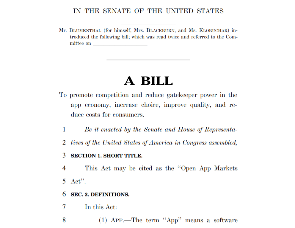 当地时间周三,美国参议院三名跨党派议员正式公开“开放应用市场法案”(OnAarktAct),旨在重塑这个由苹果、谷歌占据统治地位的市场。相较于谷歌,强调封闭生态的苹果料将受到更大冲击。 (来源:美国参议院)(来源:美国参议院) 该法案由民主党参议员RichardBlunthal、AyKlobuchar和共和党议员arhaBlackburn发