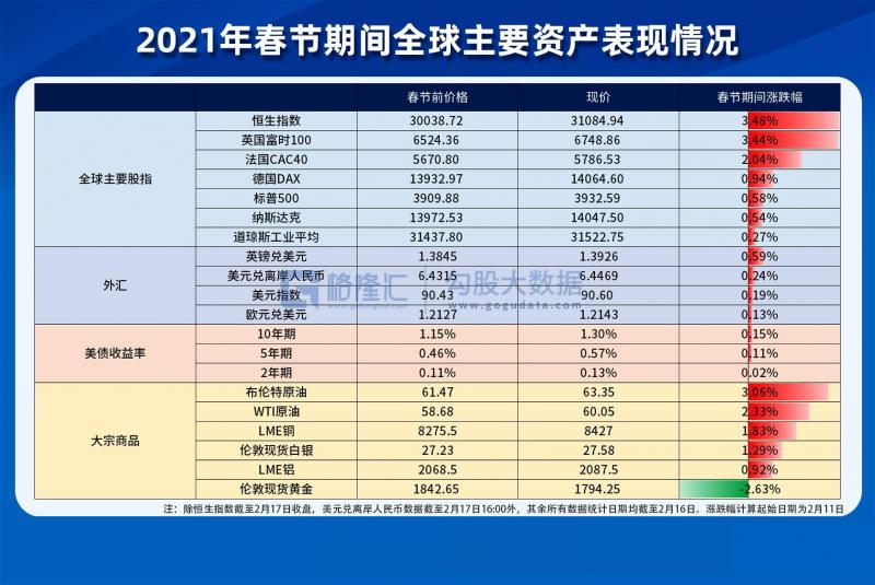 中信证券宏观研究团队指出,春节假期期间海外市场整体风险偏好提升,主要得益于欧美国家疫情改善、疫苗接种进度加快以及拜登财政刺激方案顺利落地的预期。经济复苏和再通胀预期下油价和工业金属价格再创新高。尽管美债10年期收益率突破1.3%,但主要源于通胀预期上扬而非实际利率抬升,因而对整体估值的影响并不显著。预