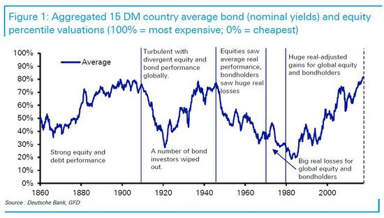 【一个新的“混乱时代”即将到来】 根据德意志银行著名的200年市场回顾,股票和债券过去160年来的最佳表现即将结束,一个新的“混乱时代”即将到来。 德意志银行的研究团队指出,15个发达市场的股票和债券综合价格今年达到至少1860年代以来的最高水平,但受到政治经济领域重大转变的影响,这种涨势正在发生扭曲。 从社会
