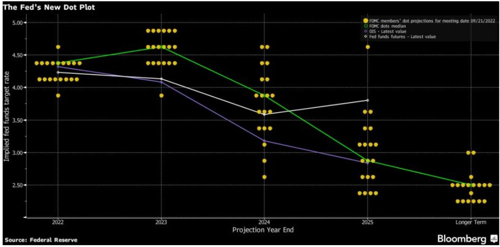 花旗集团:美联储点阵图有传递鹰派信号的风险 我们预计美联储将加息75个基点,将联邦基金利率提高到3.00-3.25%。重点关注美联储的点阵图和经济预测,经济预测摘要中的联邦基金利率预期中值仍有明显高于6月份预期的鹰派风险,预计点阵图将显示,2022年底联邦基金利率中值将升至4.0-4.25%,2023年将升至4.5%左右。新闻发