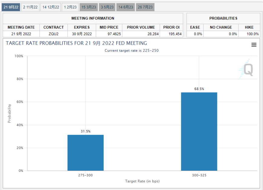 根据芝加哥商品交易所集团(C)的“美联储观察(FdWatch)”工具,截至8月28日,美联储在9月政策会议上加息75个基点的概率高达68.5%,加息50个基点的概率为31.5%。 “美联储观察”工具通过C公布的30天期联邦基金期货价格来预测未来美联储升降息的概率,其价格通常反映市场对联邦基金利率水平的预期。 “历史告诫我们,