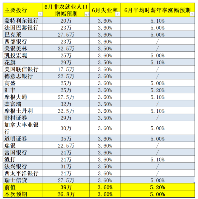 美国劳工统计局(L)将于7月8日北京时间20:30发布6月就业报告,随着发布时间的临近,以下是10家主要银行的经济学家和研究人员对即将发布的就业数据的预测。 预期非农就业人数在5月份增长39万之后,将增长27万。 与此同时,失业率将保持在3.6%不变。 加拿大国民金融银行 “就业人数可能增加了22.5万。 家庭调查预计将