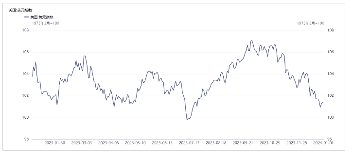 2023年12月29日,美元指数于当年最后一个交易日的纽约时段尾盘收于101.38,全年下跌2.11%。年内美元指数最高触及107.35。 2024年第一季度的美元指数走势呈现了多重因素的影响。在2024年初,美元指数表现强劲,主要受到季节性因素的提振。2023年,美元录得了三年来最差的年度表现,但在2024年开年时,美元走强,可能