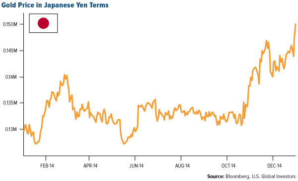 日元计价的黄金已经远高于52周峰值。并非巧合的是,日元在过去的两年里几乎崩溃。但黄金持有者在日本能够保留他们的购买力,至少他们现有财富的一部分是属于实物黄金的投资。