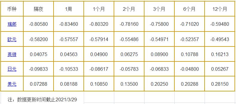 1个月LIBOR:瑞郎报-0.80320%,欧元报-0.57914%,英镑报0.04900%,日元报-0.08617%,美元报0.10850%。