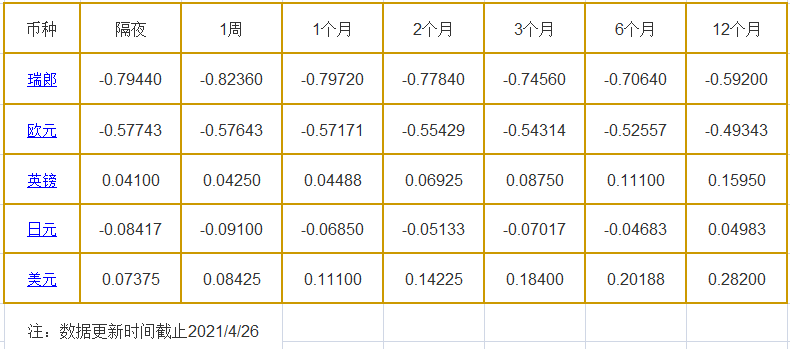 1个月LIBOR:瑞郎报-0.79720%,欧元报-0.57171%,英镑报0.04488%,日元报-0.06850%,美元报0.11100%。
