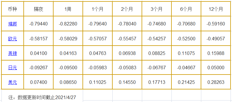 1个月LIBOR:瑞郎报-0.79640%,欧元报-0.57057%,英镑报0.04763%,日元报-0.05983%,美元报0.11025%。