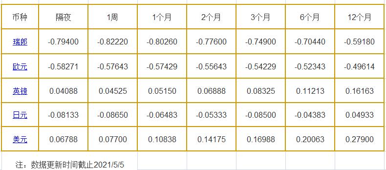 隔夜LIBOR:瑞郎报-0.79400%,欧元报-0.58271%,英镑报0.04088%,日元报-0.08133%,美元报0.06788%;
