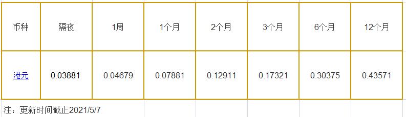5月7日香港银行间同业拆借利率港币: