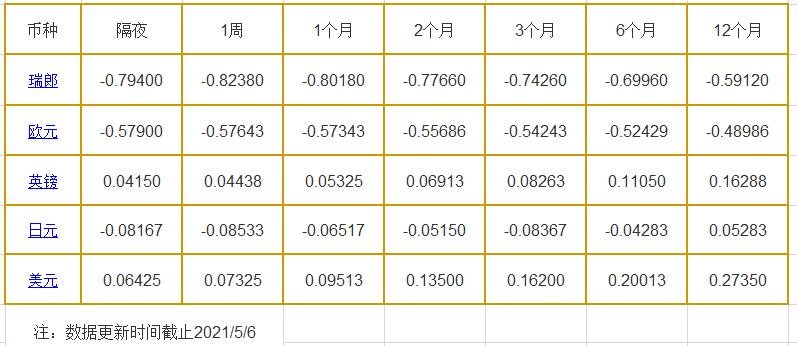 1个月LIBOR:瑞郎报-0.80180%,欧元报-0.57343%,英镑报0.05325%,日元报-0.06517%,美元报0.09513%。