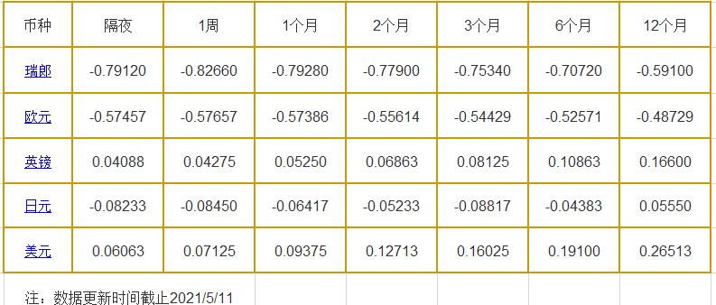1个月LIBOR:瑞郎报-0.79280%,欧元报-0.57386%,英镑报0.05250%,日元报-0.06417%,美元报0.09375%。