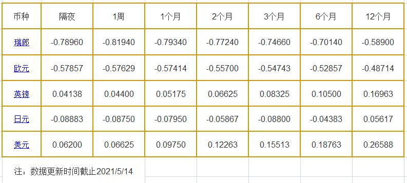 1周LIBOR: 瑞郎报-0.81940%,欧元报-0.57629%,英镑报0.04400%,日元报-0.08750%,美元报0.06625%;