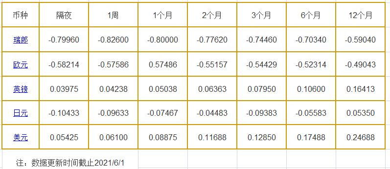 隔夜LIBOR:瑞郎报-0.79960%,欧元报-0.58214%,英镑报0.03975%,日元报-0.10433%,美元报0.05425%;