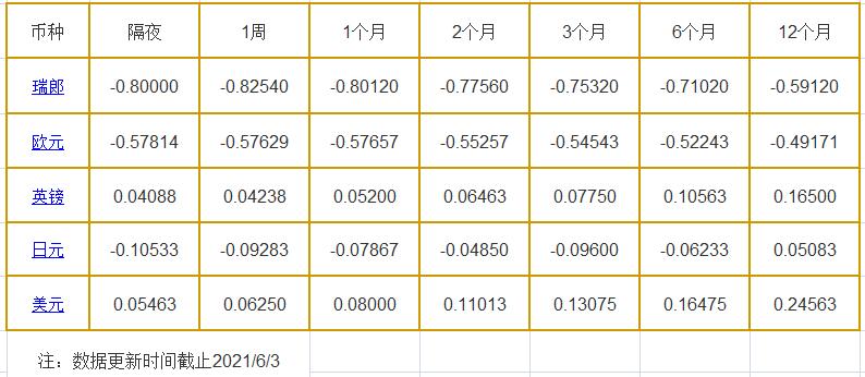 1个月LIBOR:瑞郎报-0.80120%,欧元报-0.57657%,英镑报0.05200%,日元报-0.07867%,美元报0.08000%。