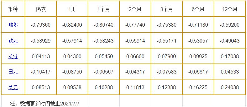 1个月LIBOR:瑞郎报-0.80740%,欧元报-0.58243%,英镑报0.05450%,日元报-0.06567%,美元报0.10288%。