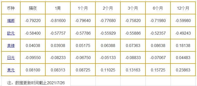 1周LIBOR: 瑞郎报-0.81600%,欧元报-0.57757%,英镑报0.03938%,日元报-0.08233%,美元报0.08313%;