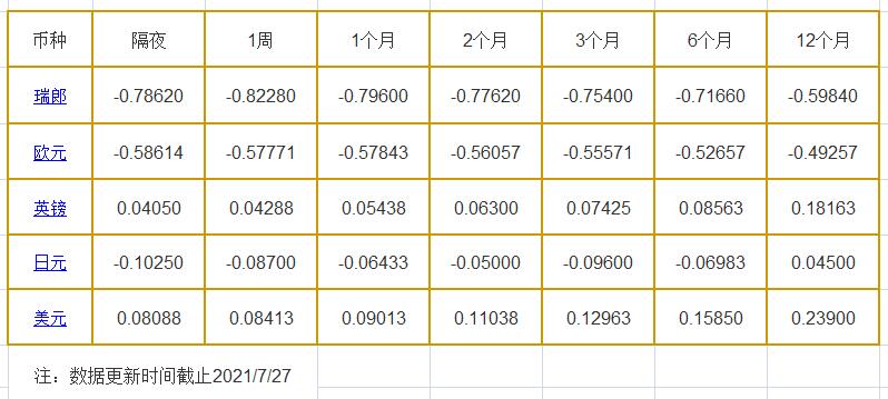 1个月LIBOR:瑞郎报-0.79600%,欧元报-0.57843%,英镑报0.05438%,日元报-0.06433%,美元报0.09013%。