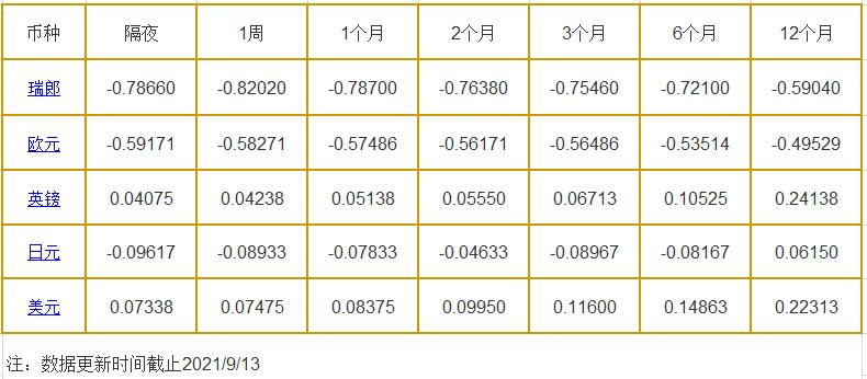隔夜LIBOR:瑞郎报-0.78660%,欧元报-0.59171%,英镑报0.04075%,日元报-0.09617%,美元报0.07338%;