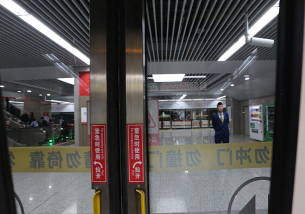 在地铁站事发地点,仍有两排保安把手门口,屏蔽门不能关闭,长时间开着,两名保安用警戒线看着门口,乘客只能从那个屏蔽门处下车,不能上车。【详细】
