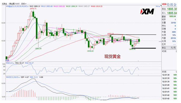 黄金昨日连续三天收阳,今天早盘拉高至1916.3后冲高回落,盘中已经跌破昨日低点1886。意味着行情打破了连续三日上涨的节奏。当前RSI指标高位,MACD多空能量不明显。走势上继续震荡是大概率,消息影响下操作把握的难度相对会很大。