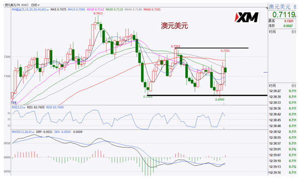 澳美上午冲高至0.7220,后跌至0.7048往回涨,整体上下串运行。技术面结构目前可以看到一个箱体状轮廓,日内走势走箱体运行的概率大,故而把握难度也较大,上涨主要关注0.7220/0.7245压制,而0.70一线是目前水平支撑位。