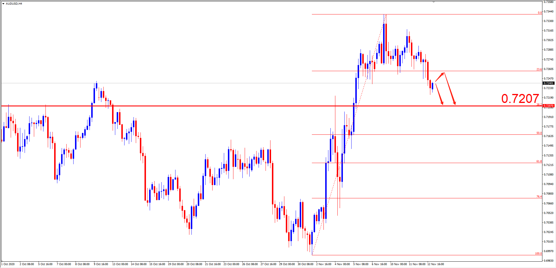 【技术点评】:H4周期,澳美筑造小型顶部形态,当前几个已跌破斐波那契23.6%回调位,后市大概率继续下行。