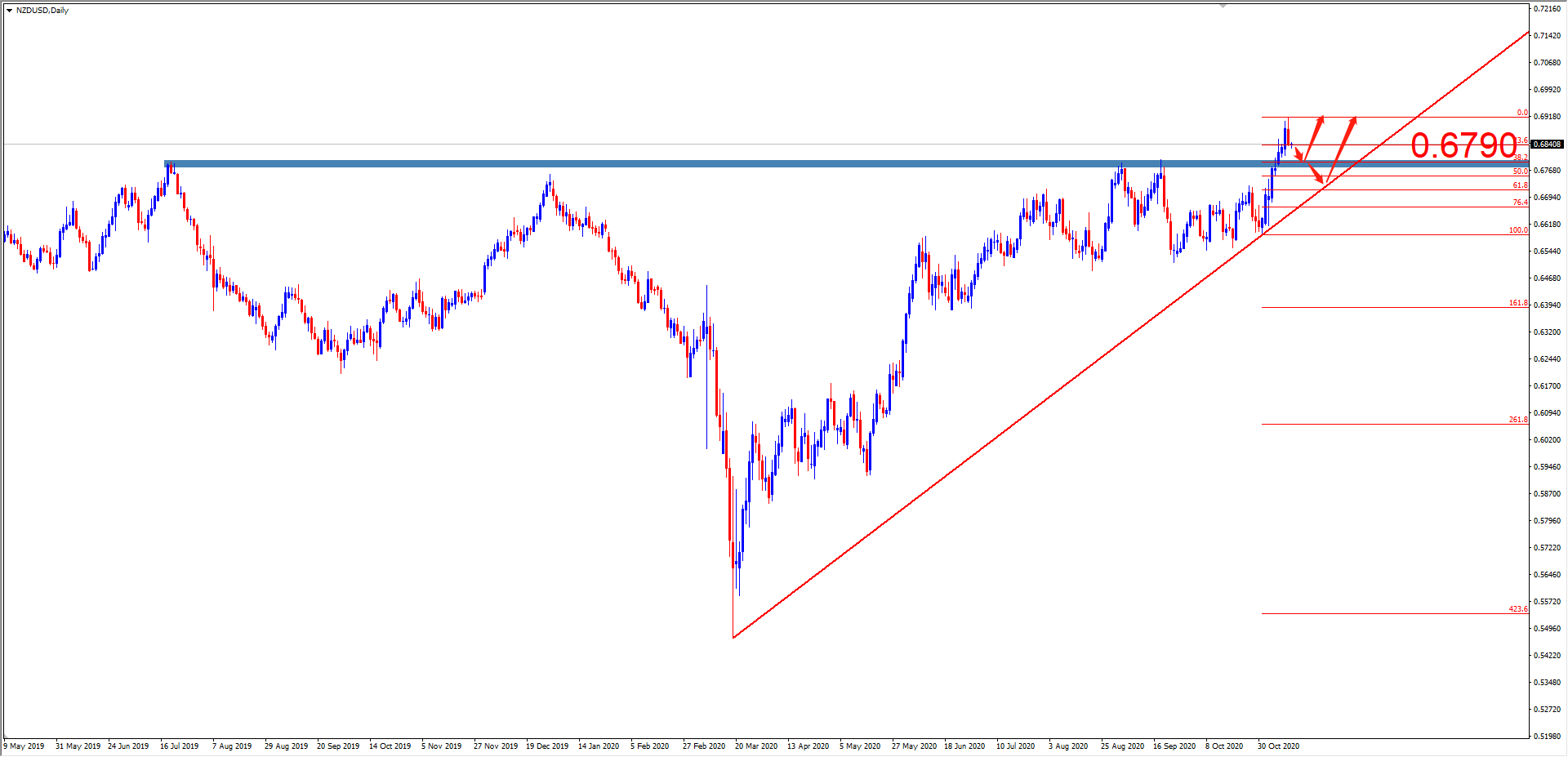 【技术点评】:D1周期,纽美保持上升趋势,当前价格突破0.6790关机阻力位后欲完成回踩动作。
