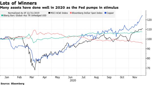眼下市场形势是这样的——受美国国债收益率低于1%拖累,美元跌到了2018年4月以来最低。这对新兴市场构成利好,亚洲美元债发行规模有史以来第一次突破4000亿美元。全球股市也创下纪录新高,铜价接近七年高位。就连比特币也刷新了最高纪录。