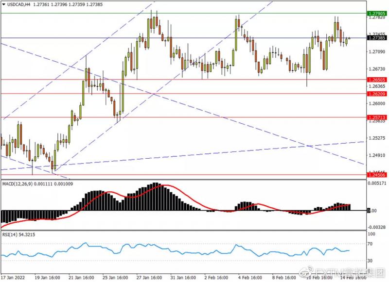 4小时图看, 美加虽然连续多日方向未决,但当前依然维系着基于1月13日及20日低点走出W底的反弹行情。若多方能在1.2650一线构筑有效防线,从而避免形成短线三重顶格局,则汇价依旧上看年内高位1.2813;但在此前还需打破箱体顶部的1.2790一线。而上行终将直面更为关键的1.2835上方强阻——去年全年至今所构筑的潜在大型复合头肩底形态颈线位阻力区。指标来看,MACD快慢线在零轴上方相互粘连;RSI依旧固守强势区,提示市场虽偏强势,但尚缺有力的上行动能。