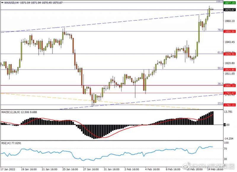 日线图看,持续受俄乌局势剑拔弩张的刺激,金价隔夜进一步拉升,在上穿去年12月15日及1月28日低点连线构筑上行通道上轨后,正直逼去年11月创下的7个月高点1877。受地缘政治事件外力刺激,市场上行步入加速段,若能摆脱原有上行通道的牵引并站上1877关键位,金价有望很快朝去年5月19日高点1890及1900整数位进发。指标方面,MACD在零轴上方形成金叉后加速向上,快慢线开口放大;RSI上行逼近超买区,反映近期快涨态势。