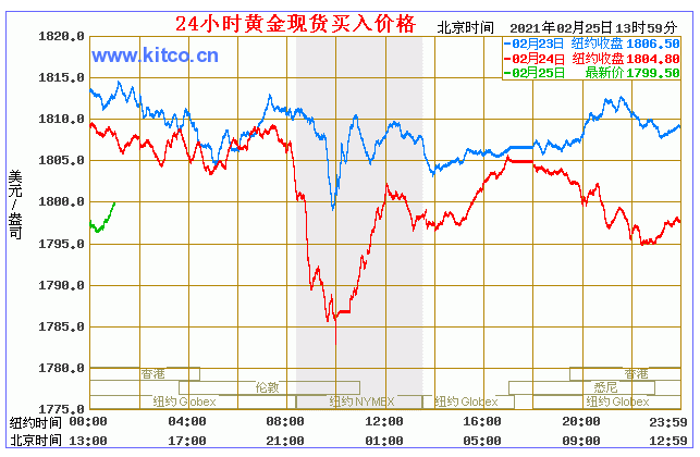 因隔夜美国10年期美债收益率一度升破1.4%,成为去年2月以来最高,令金价走势陷入困境。周四(2月25日)亚市盘中,现货黄金试探1790美元关口,金价最低跌至1793.7美元,截止发稿现报1798.63美元,日内跌幅0.36%。