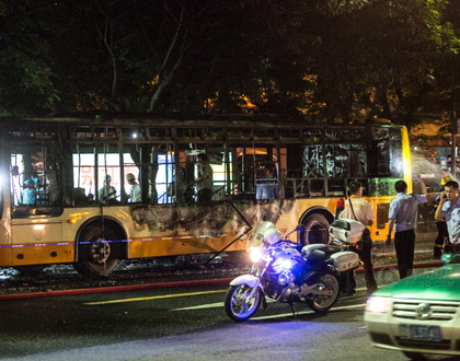 记者当晚9时抵达现场时,一股浓烈的烧焦味十分刺鼻,出事的公交车停在公交车站边上,整辆车被烧得只剩下铁架框子。消防人员正往车上浇水,虽然有警察在维持秩序,但场面仍相当混乱。附近道路车辆行驶缓慢,交警正现场指挥车辆通行。