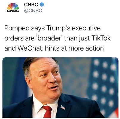据CNBC周四(8月13日)最新报道,美国国务卿蓬佩奥(MikePompeo)表示,特朗普总统针对TikTok和 的行政命令可能“范围更广”,不只是这两个应用程序。
