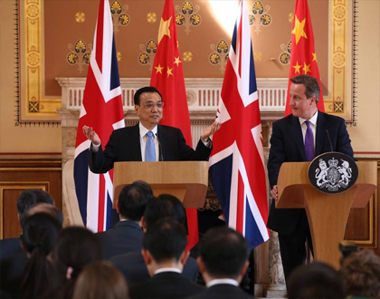 6月17日下午,伦敦阳光明媚,一改前日的凉意。在颇有古典特色的英国外交部大楼内,中国国务院总理李克强与英国首相共同见证了两国间一系列合作文件的签署。随后,两位领导人步入位于2层的洛加诺厅,共同会见早已等候在此的大批中外记者。
