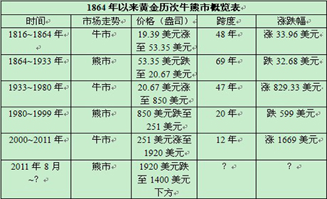 黄金(Gold)即金,化学元素符号Au,是一种软的,金黄色的,抗腐蚀的贵金属。金是最稀有、最珍贵的金属之一。黄金金的化学符号为Au;Au的名称来自一个美丽罗马神话中的黎明女神欧若拉(Aurora )的一个故事,意为闪耀的黎明。马克思有名言:“金银天然是货币,货币天然不是金银。”黄金作为最名贵的金属,一直都被赋予特殊的财富和文化内涵。然而由于黄金开采难度较大而储藏量相对较小,因此在相当长的历史时期内,各国都采取银本位制。随着资本主义的飞速发展,黄金在贸易中的重要性迅速提高,经过了200多年的金银复本位制的过渡,到了1816年拿破仑战争后,英国率先实施金本位制。此后一直到一次大战后,作为当时全球首屈一指超级大国的英国,其货币英镑一直与黄金挂钩,保持固定比价,一盎司黄金的标准售价为3英镑17先令10.5便士。在这段时间里,美国的国力逐渐走强,尤其以1864年美国南北战争前后为显著分水岭,此前美元对英镑持续贬值,此后则由贬转升。因此,若以美元计价,则黄金先后经历了一波牛市和熊市。